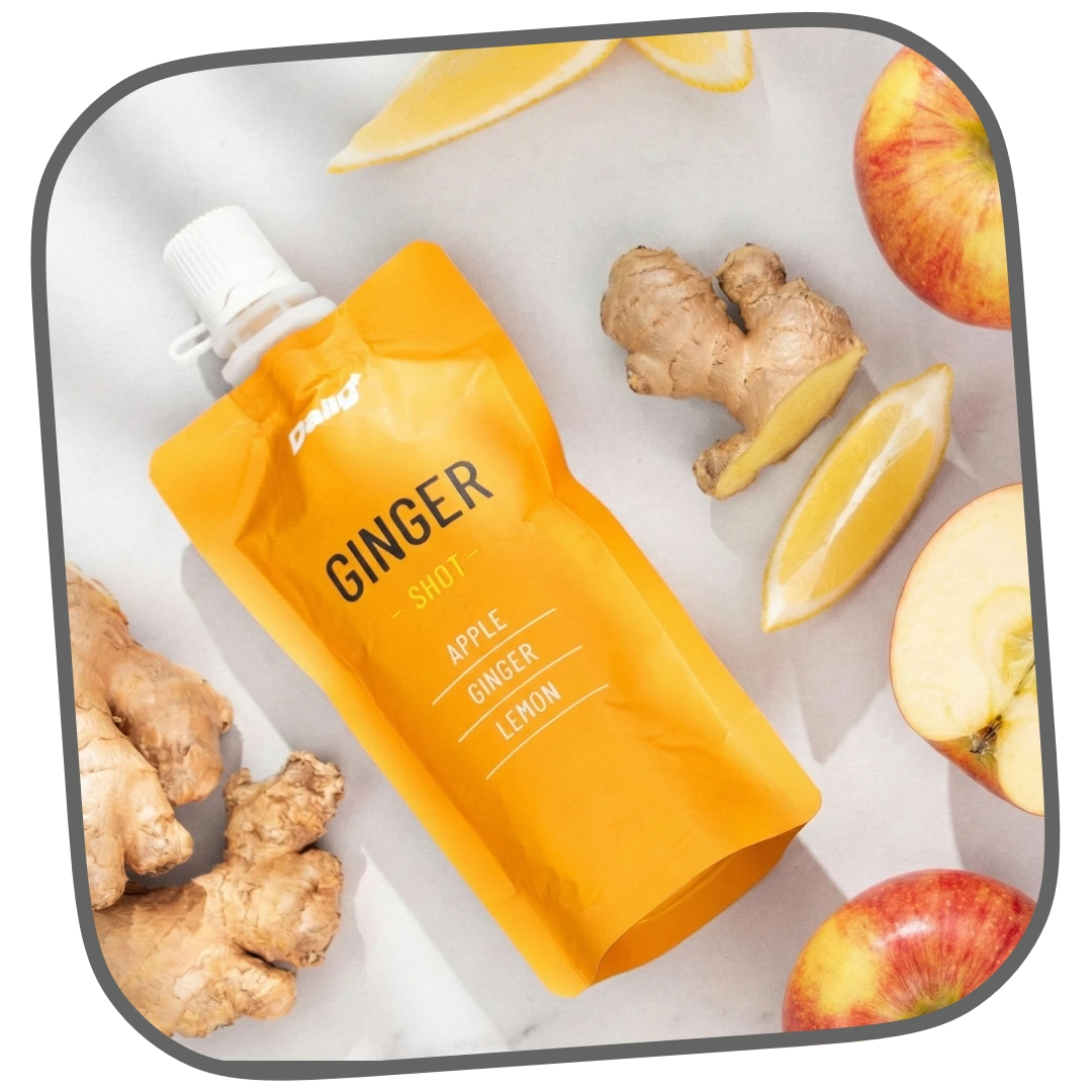 The Daily+ Ginger Shot is a 50g. functional shot designed to give you a quick and fiery boost to wake up your senses and fuel your body. Made with 100% UHT-treated fruit and juice extracts, without the need for refrigeration.